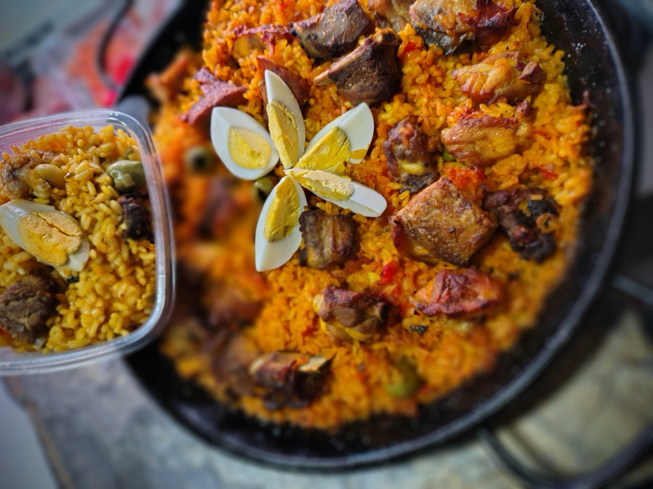 Nuestra paella de arroz con costillas y alas se elabora siguiendo una receta tradicional, combinando arroz en su punto con costillas de cerdo, alitas de pollo y panceta, logrando un plato sabroso y reconfortante.
